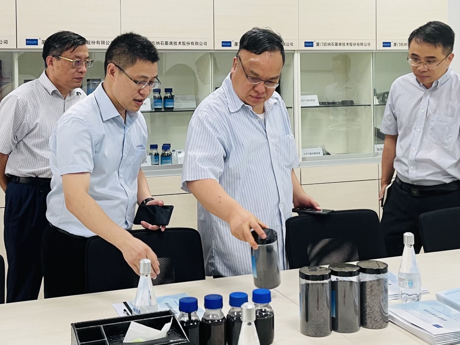 2021年6月29日上午,在海發(fā)集團黨委副書記、公司副總裁范筱林陪同下,華為技術有限公司創(chuàng)始人之一、高級副總裁鄭寶用一行到訪廈門凱納。凱納公司董事總經理方崇卿、技術總監(jiān)洪江彬等在公司生產基地向各位來訪領導介紹了公司發(fā)展情況、核心石墨烯材料及未來規(guī)劃。