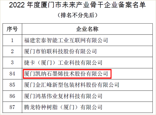 近日,廈門市科技局公布了“2022年度廈門市未來產業骨干企業”名單,共計107家企業入圍。經合規性審查、專家評審和公示,廈門凱納石墨烯技術股份有限公司(以下簡稱“廈門凱納”)作為國內石墨烯的開創企業和領軍企業,成功入選2022年度廈門市未來產業骨干企業。