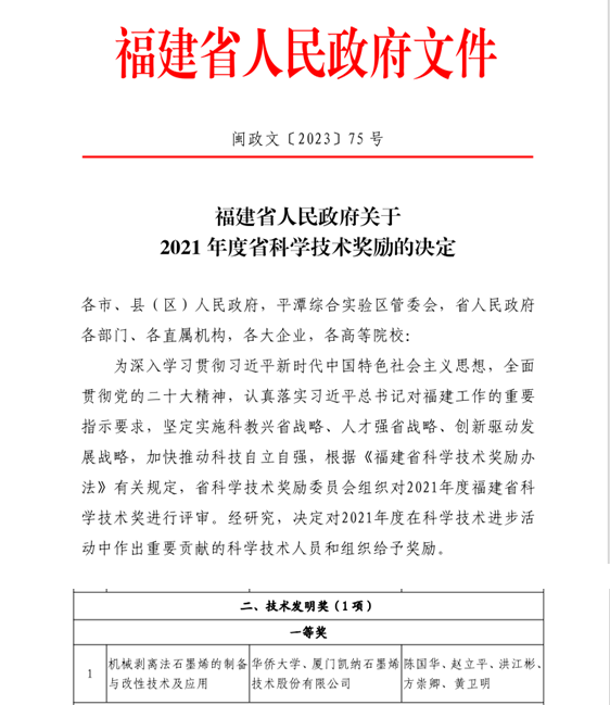 日前,福建省人民政府公布了《福建省人民政府關于2021年度省科學技術獎勵的決定》(閩政文〔2023〕75號),由華僑大學、廈門凱納石墨烯技術股份有限公司(以下簡稱“廈門凱納”或“凱納”)作為主要完成單位,作為“機械剝離法石墨烯的制備與改性技術及應用”項目的主要完成人的華僑大學教授(廈門凱納首席科學家)陳國華、廈門凱納董事長趙立平、總經理方崇卿、技術總監洪江彬、技術部經理黃衛明榮獲了福建省技術發明獎一等獎。